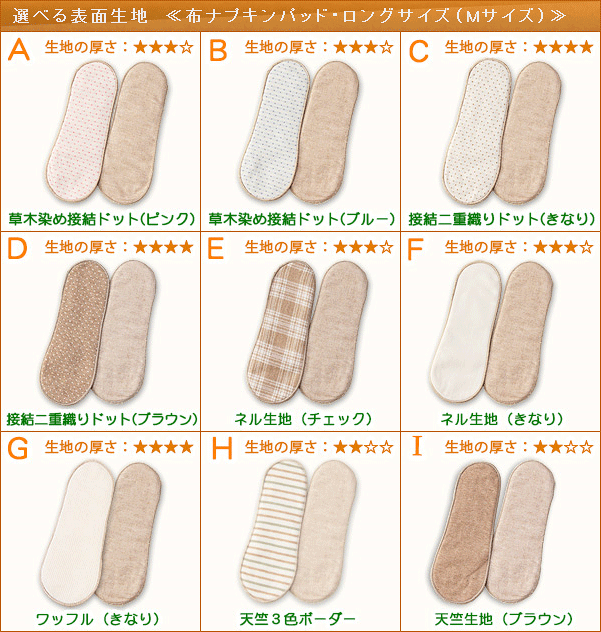 当店の布ナプキン用パッドは、大きさが「S」、「M」、「L」の3種類、厚さも「普通」と「厚手」の2種類の計6タイプの布ナプキンを販売しております。